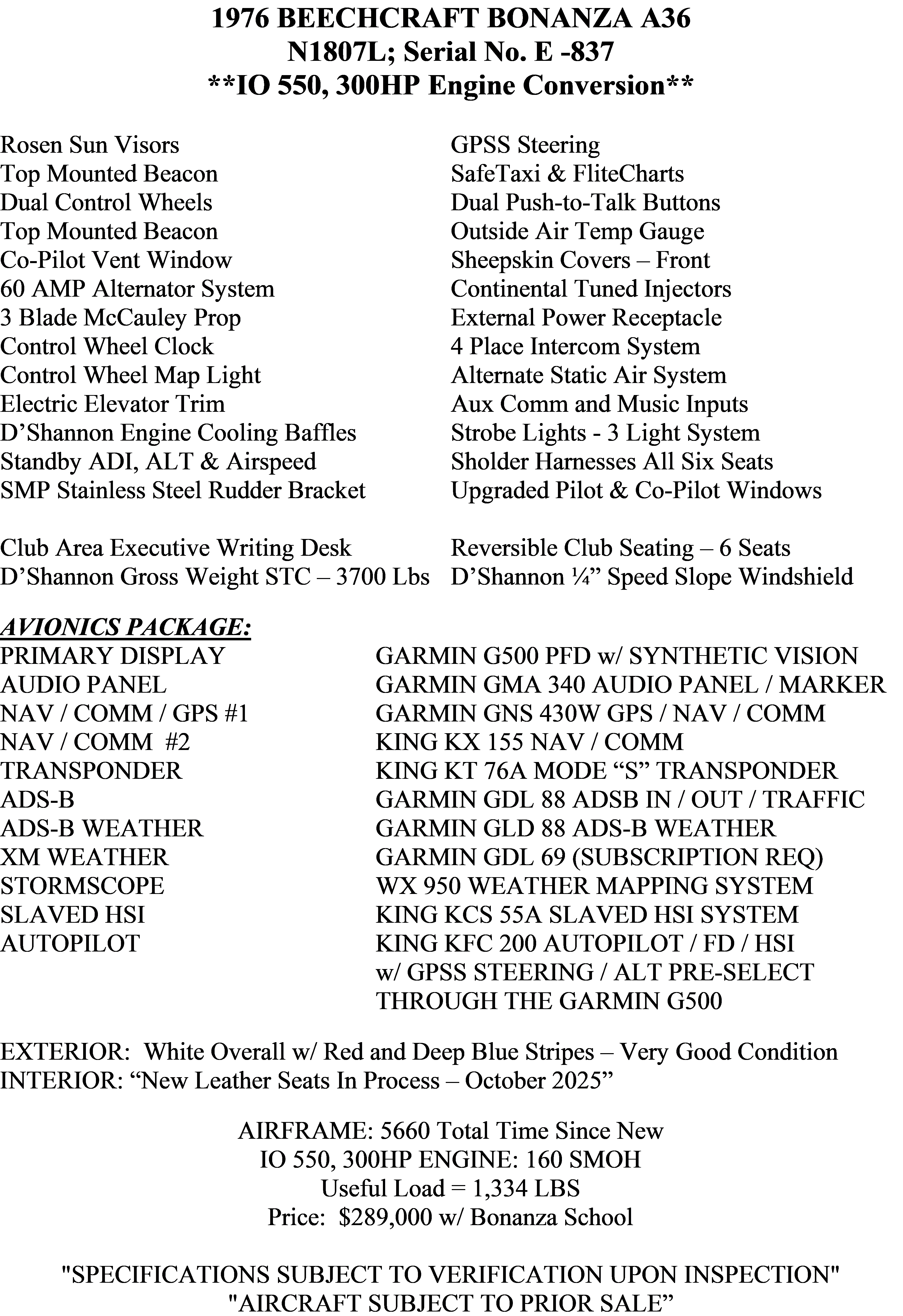 N1807L 1976 A36 Bonanza, Serial No. E-837, 5660 Total Time Since New, IO-550B 300 Horsepower Factory Reman Engine 160 SFRM, 3 Blade McCauley Prop, King KFC-200 Autopilot with GPSS Steering Intergrated to Garmin G500 EFIS Glass Panel Primary Flight Display and Multifunction Display, Garmin GNS-430W GPS/Nav/Com w WAAS, King KX-155 Digital Nav/Com #2, King KT-76A Transponder, Garmin GDL-88 ADS-B In & Out for Subscription Free ADS-B Traffic and Weather, BFG WX-950 Stormscope, Garmin GMA-340 Audio Panel w 3 Light Marker Beacon and Four Place Intercom System, Dual Glideslope Indicators, 74 Gallons Usable Fuel, Dual Control Wheels as well as a Single Control Yoke that comes with the airplane, EGT Gauge, Sigma Tek 500B Air Driven Standby Attitude Indicator, Mid-Continent Standby Airspeed Indicator, Electric Elevator Trim, D’Shannon 1/4" Speed Slope Windshield, Upgraded Pilot and Co-Pilot Windows, Rosen Sun Visors, Alternate Static Air, Reversible Club Seating with 6 Seats, 3-Light Strobe System, Landing and Taxi Lights, Shoulder Harnesses all six Seats, Complete Logbooks, SMP Stainless Steel Rudder Bracket, Factory Internal Corrosion Proofing, Excellent Paint, NEW LEATHER SEATS IN PROCESS OCT 2025, D'Shannon Gross Weight Increase - Useful Load = 1334 Lbs, No Damage History, Price = $289,000 with Bonanza School, May 2025 Annual Inspection