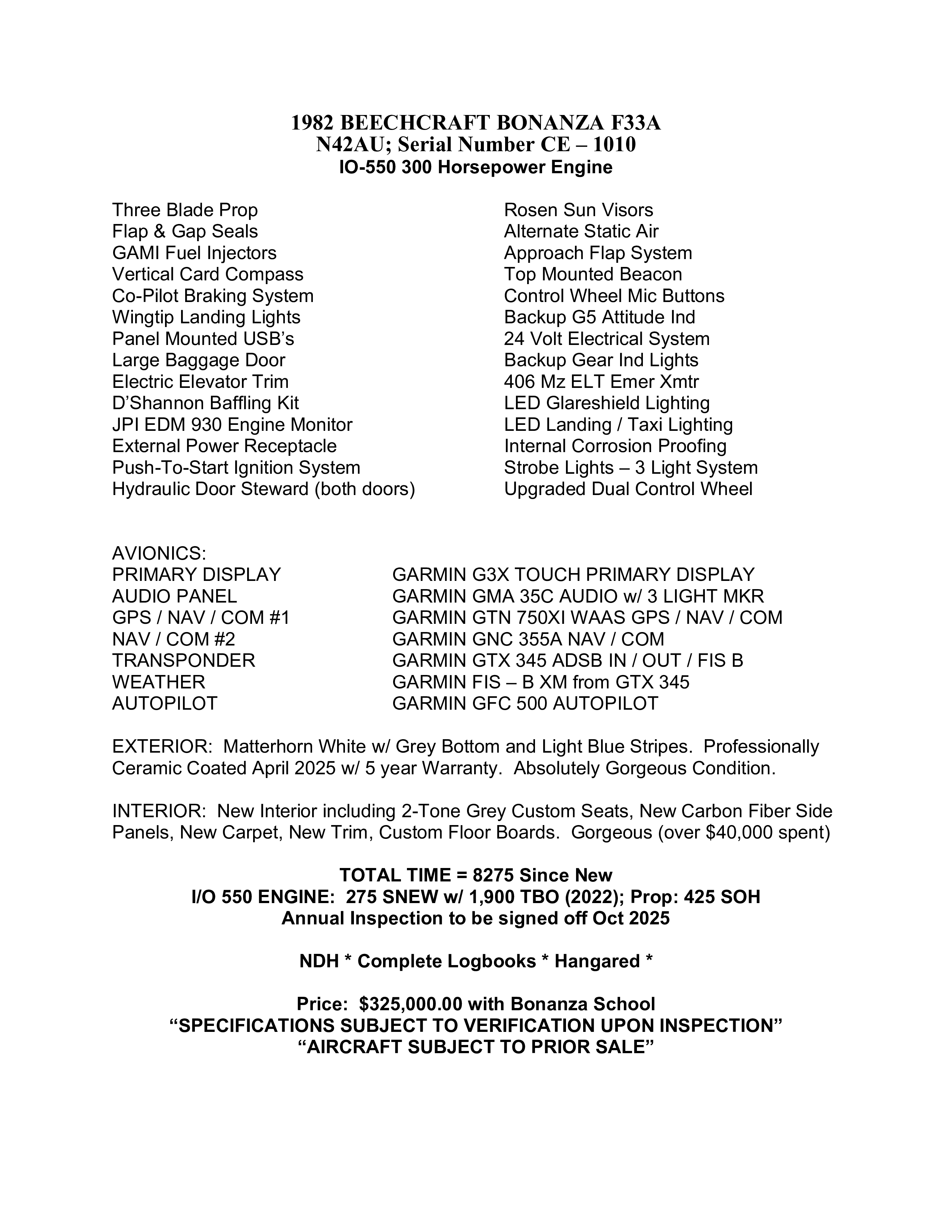 1982 F33A, N42AU, 8275 total time, 275 SNEW IO 550, 300HP engine w/ 1900 TBO, Garmin G3X Touch, Garmin 750XI, Garmin 35C Audio Panel, Garmin 355A, Garmin 345 w/ ADSB in / out / traffic / FIS B, Garmin GFC 500 Autopilot, Garmin G5 Backup, New Custom Interior, New Floor boards, New Carpet, New Carbon Fiber Panel, LED Lighting, JPI 930 Engine Monitor, GAMI Injectors, Rosen Visors, Gorgeous Paint w/ New Ceramic Coating and 5 year warranty. NDH. Price= $325,000 with Bonanza School