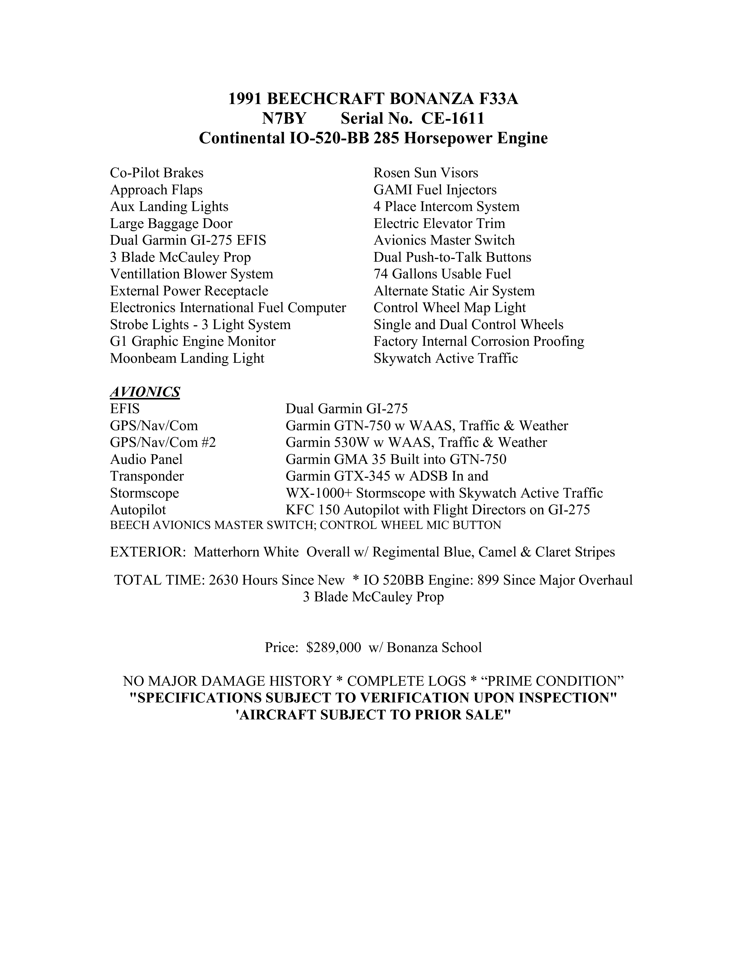 N7BY 1991 F33A Bonanza, 2630 Total Time, IO520 285 Horsepower Engine 899 SMOH, 3 Blade Prop, Dual Garmin GI-275 Multi Function Displays, Garmin GTN-750 GPS/Nav/Com, Garmin GNS-530W GPS/Nav/Com, Garmin GTX345 Transponder with ADSB In/Out with Traffic and Weather, Garmin GMA35 Integrated Audio Panel in 750, Engine Insights Graphic Engine Monitor, Skywatch Active Traffic, Large Baggage Door, GAMI Fuel Injectors, Ventelation Blower System, Approach Flaps, Co-Pilot Brakes, Spar AD does not apply, No Damage History, Complete Logbooks, Price= $289,000 with Bonanza School
